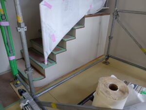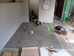 内装の床張り工事が始まりました!塩ビタイルの施工状況ですね。