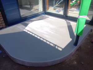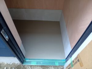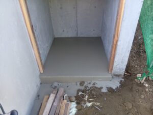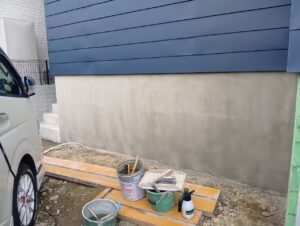 外部の左官工事が進んできました!テラスや基礎巾木の仕上げ状況ですね。外部物置などの床面モルタル金ゴテ仕上げも始まりましたね。