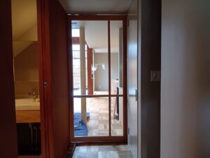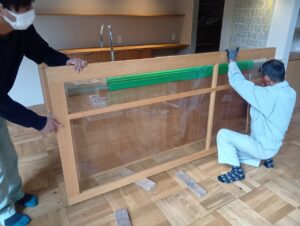 内部木製建具のガラス入れを行いました!ガラス面が大きので安全面を考慮し強化ガラスを入れてあります。
