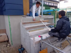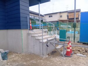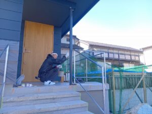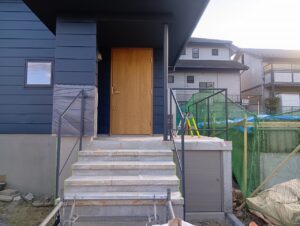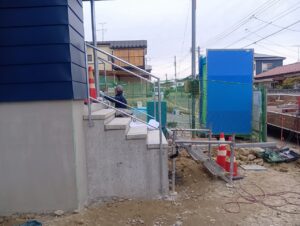 玄関アプローチ廻りの階段部の手すりの取付けの施工をしました!取合いを確認しながら進めていきます。しっかり納まりましたね!