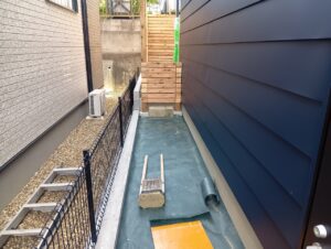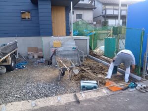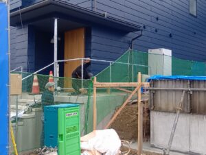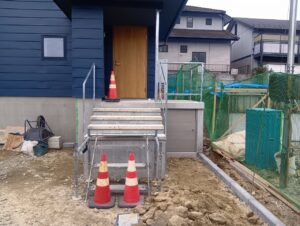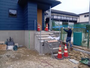 外構工事が進んできました!建物周囲の防草シート敷きや隣地との境の地先ブロックの設置、玄関アプローチの階段踏板の石張りなど、工事の進捗に伴いいい感じの雰囲気です。