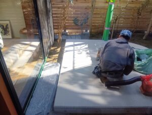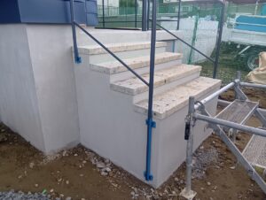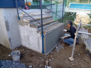 外部の左官工事の施工状況です。外構工事との取り合い部分ですね。