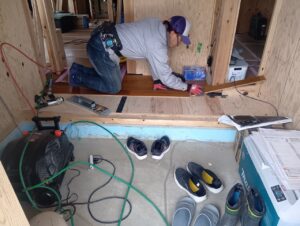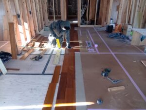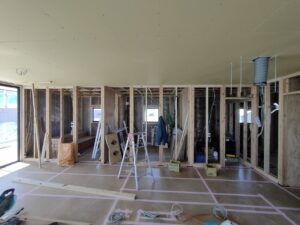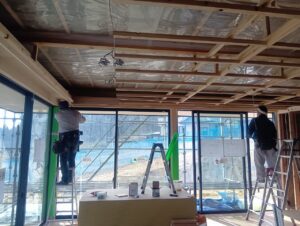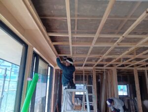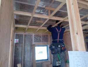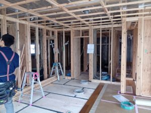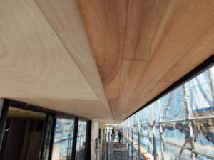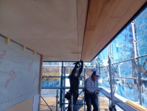 木工事がだいぶ進んできました!床張りも始まりましたね。天井廻りのボックス取付けやボード張りも進んできました。軒天の板張りも始まりましたね。いい感じです!