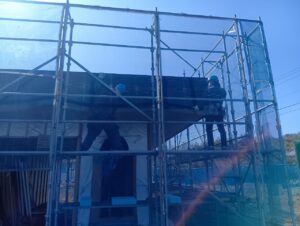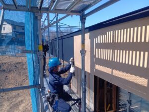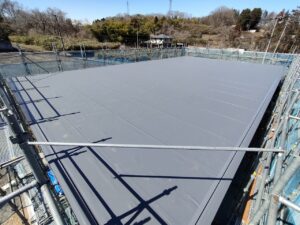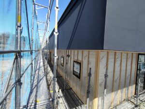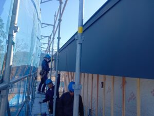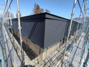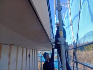 破風になる部分の鋼板取付け作業が始まりました!屋根から軒天までの距離があるため鋼板は厚手のもので選定してます。仕舞いがキレイですね!